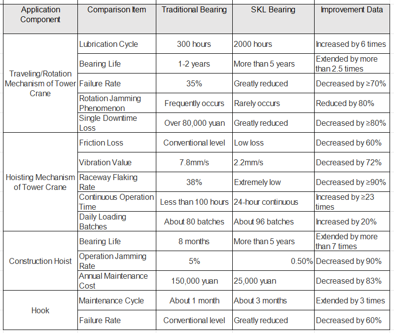 A large construction project deployed 8 QTZ80 tower cranes and 4 SC200/200 construction hoists. Frequent failures of original conventional bearings affected construction progress. After replacing with adapted SKL bearings in 2023, one-year operation data showed: overall failure rate dropped from 32% to 4.5%, annual maintenance times reduced from 18 to 2, annual maintenance cost decreased from 860,000 CNY to 120,000 CNY, construction period advanced by 15 days, hoisting accuracy error ≤±1mm, with zero safety incidents and adaptation to extreme construction site conditions.