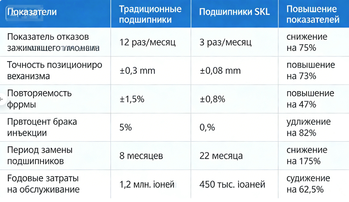 Типовой случай: При производстве компонентов для воздуховодов автомобильных кондиционеров традиционные подшипники из-за ударной нагрузки вызывали смещение плит форм, требовавшее ручной регулировки 3 раза за смену. После замены на подшипники SKL 22328 за 30 дней непрерывной работы не было зафиксировано ни одного отклонения позиционирования, а производительность одной линии увеличилась на 18%.