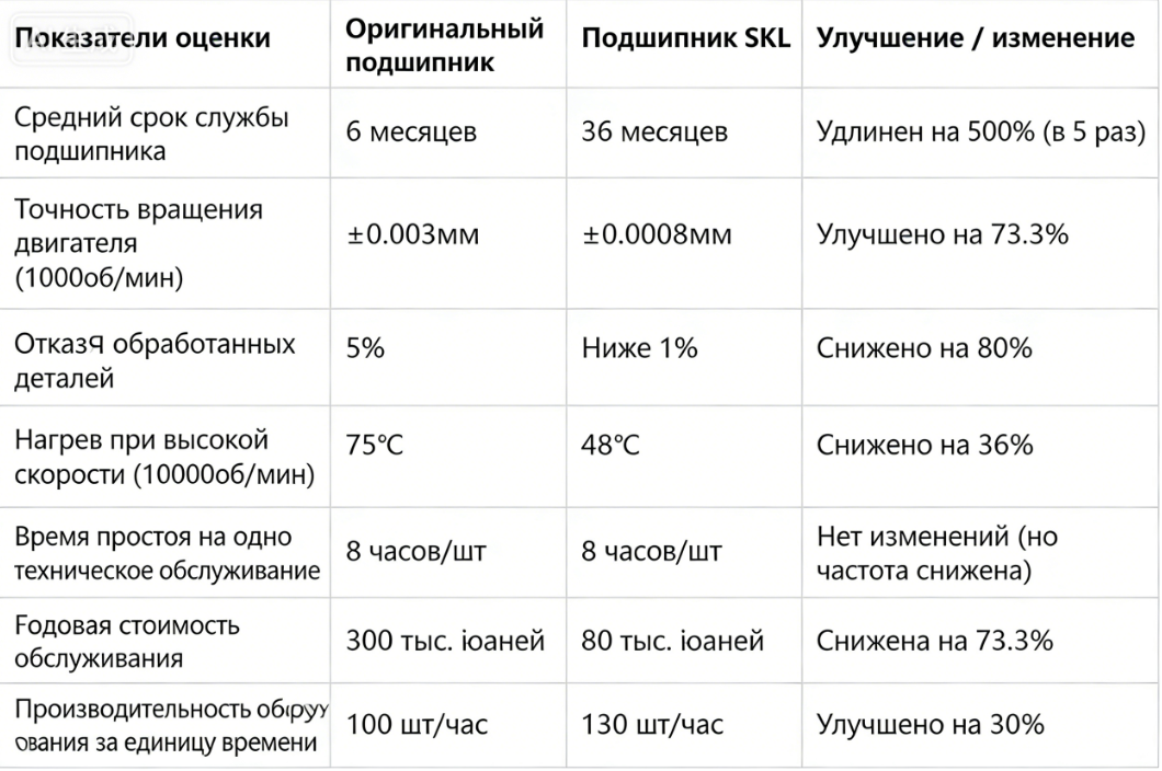 С января 2025 года предприятие по производству автоматического оборудования использует ультраточные подшипники SKL в 200 серводвигателях (в основном применяемых в сверлильных станках для ППБ и станках для обработки автомобильных деталей), что привело к значительному улучшению производительности оборудования и эффективности производства. Основные данные представлены в таблице ниже: